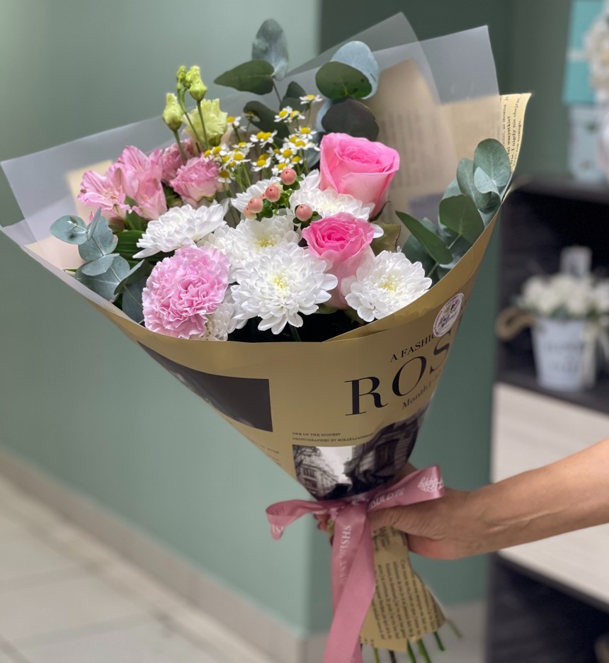 Диантус 5шт., хризантема 3шт, эвкалипт, упаковка, лента