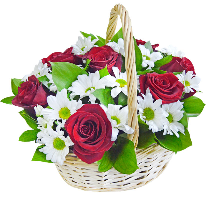Роза Эквадор 50см 7шт, хризантема кустовая 3шт, рускус, оазис, корзина ива 26-28см