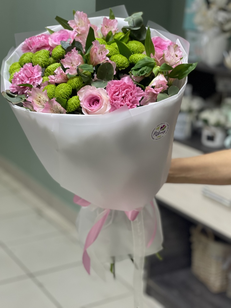 Роза эквадорская 3шт, хризантема кустовая (филингрин) 3шт, гвоздика 3шт, альстромерия 3шт, эвкалипт, упаковка, лента