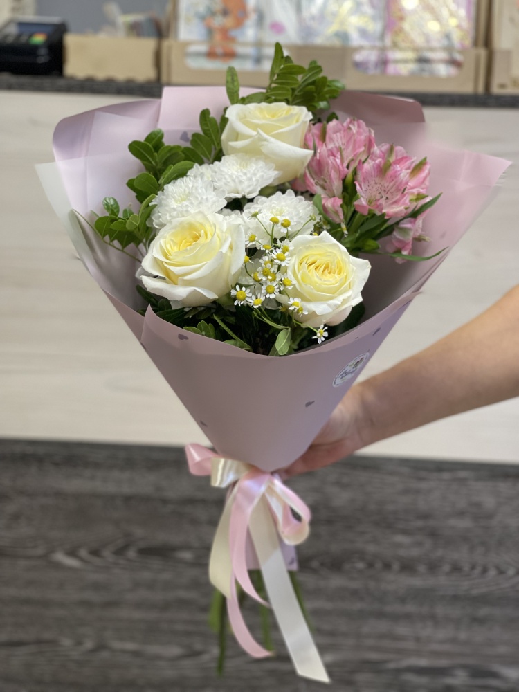 Роза Эквадорская 50см -7шт, хризантема кустовая -4шт, салал, фетр, лента