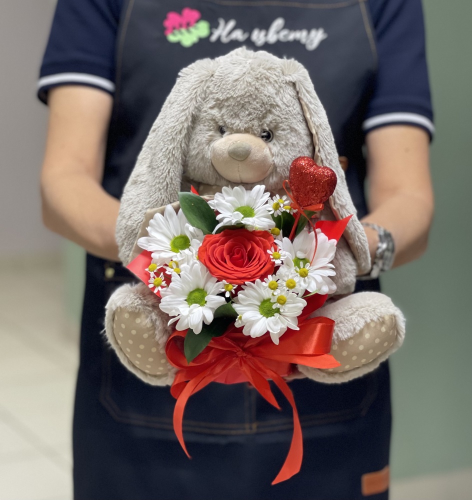 Роза Эквадорская 50см — 3шт, хризантема кустовая — 3шт, декор, фетр, лента