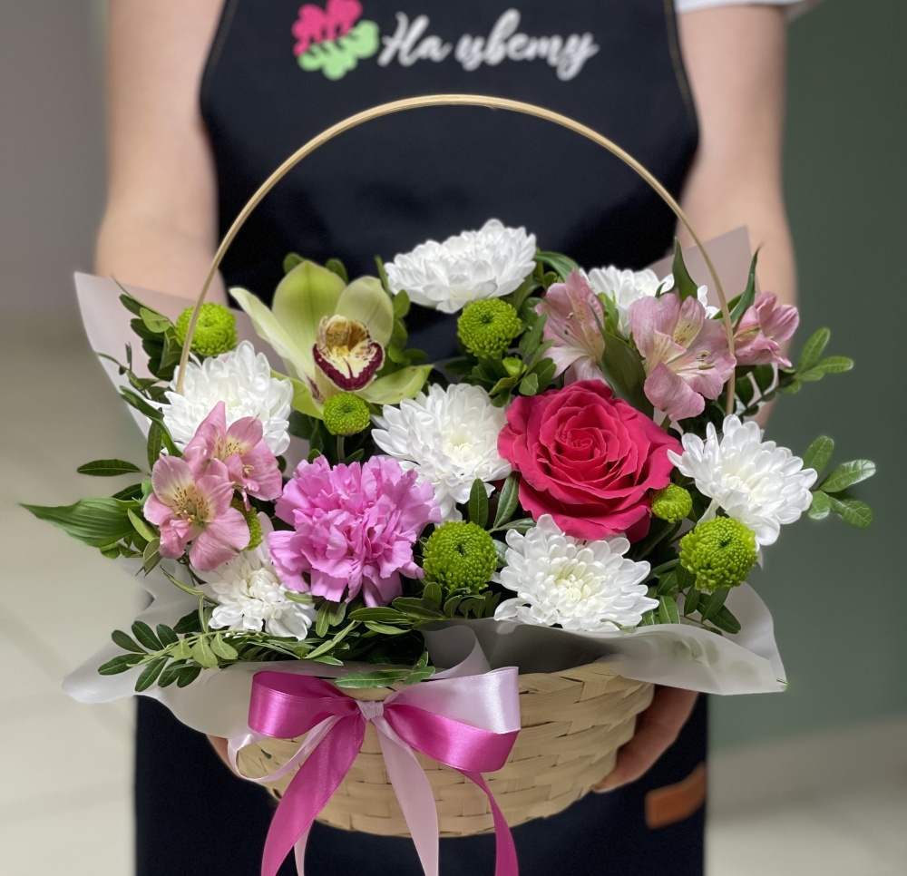 Хризантема кустовая — 4шт, эустома — 3шт, упаковка, лента
