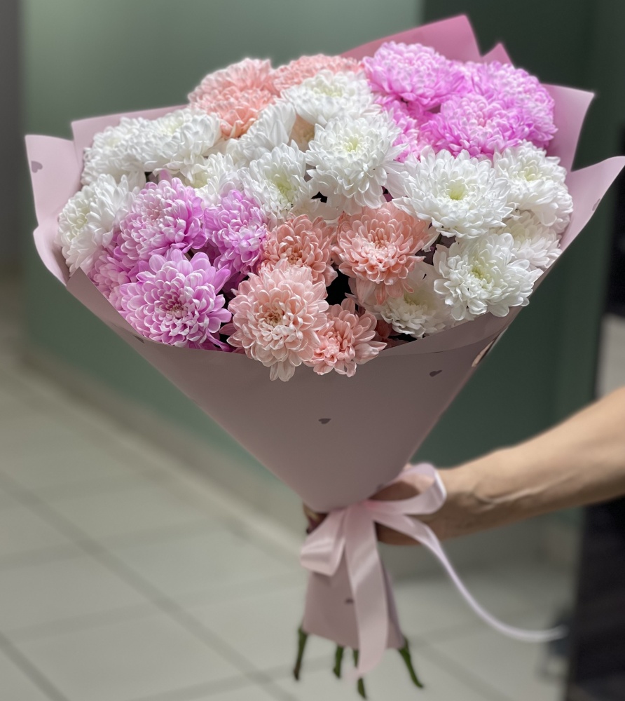 Хризантема кустовая 2шт, Роза Эквадорская 2шт, танацетум 1шт, орхидея 1шт, альстромерия 1шт, эустома 1 шт, упаковка, лента.