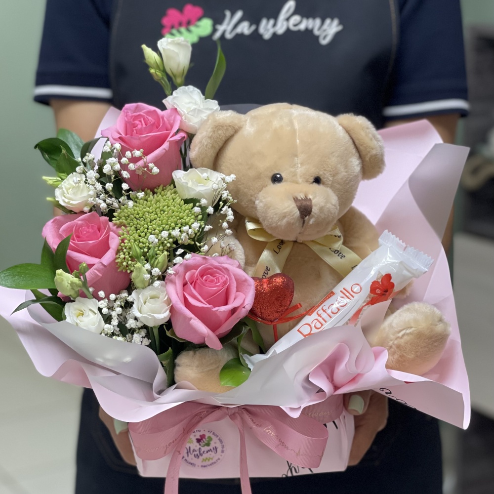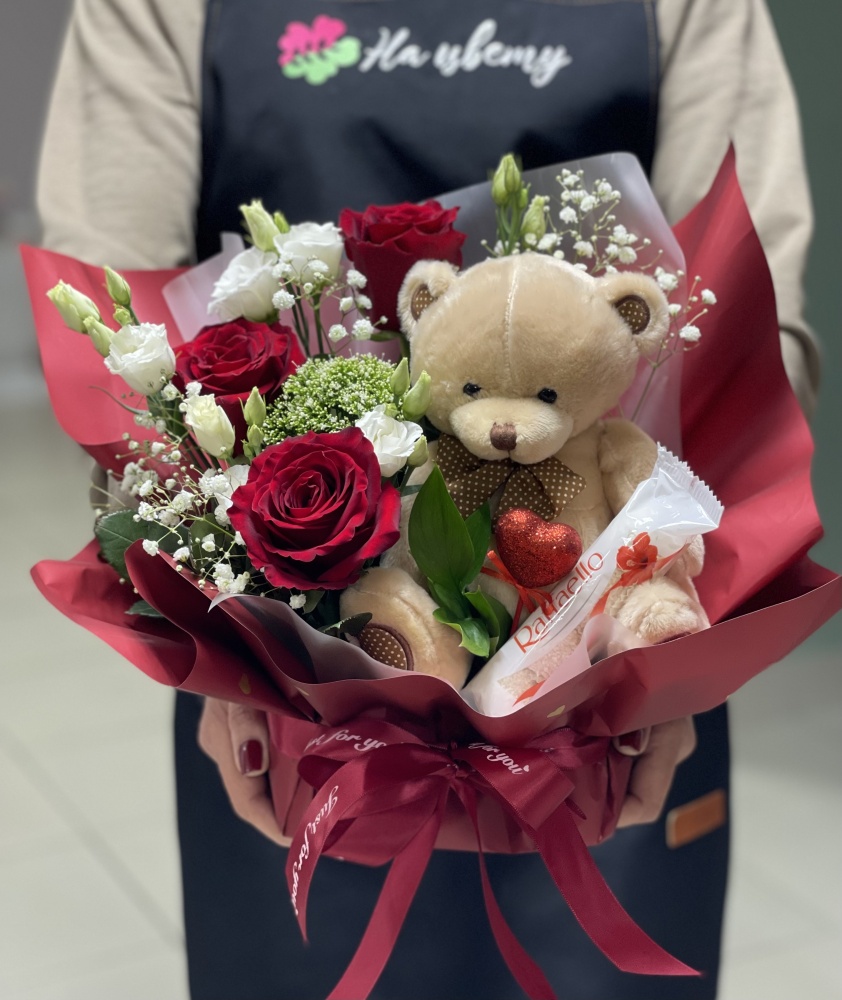 Роза Эквадорская — 3шт, эустома, гипсофила, зелень, рускус, декор сердце, губка, лента, упаковка, медведь Мич 20см бежевый, конфеты Raffaello 4шт.