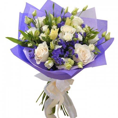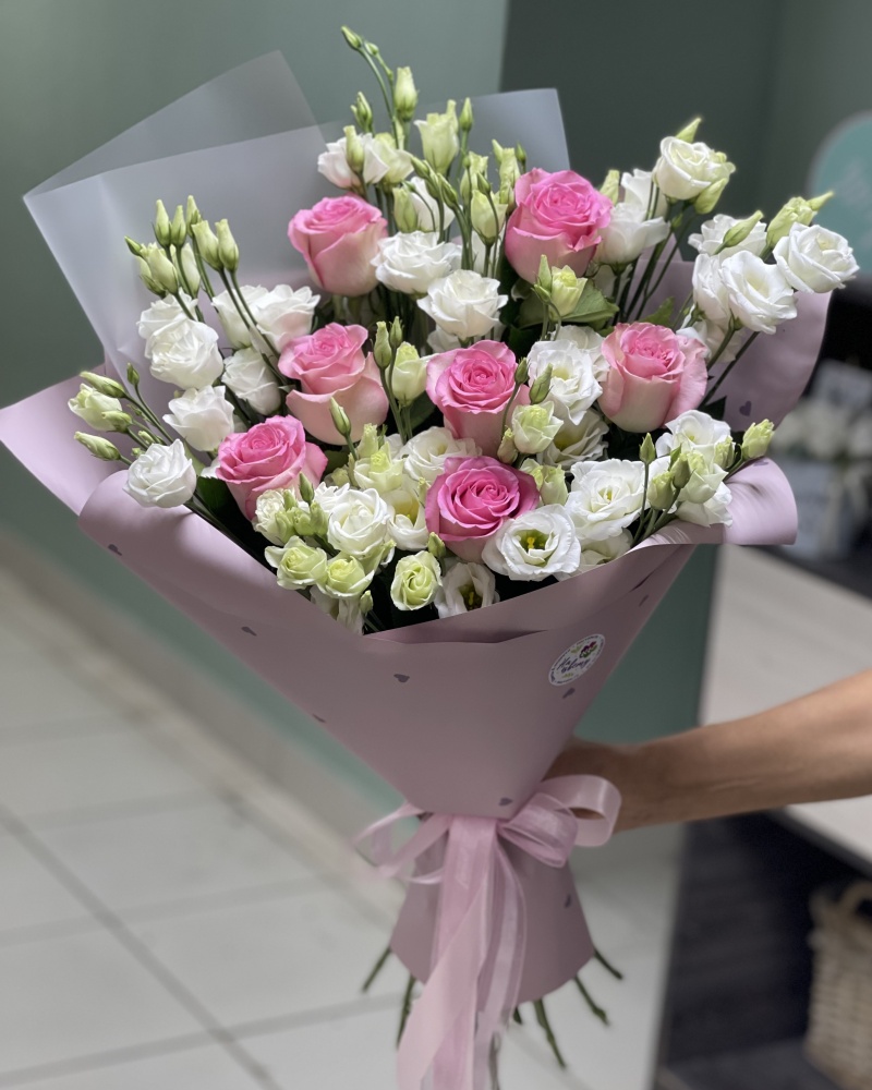 Эустома-9шт, роза Эквадорская 7-шт, упаковка, лента
