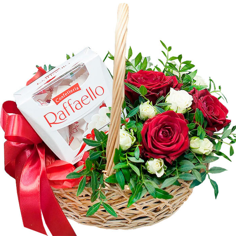 Роза Эквадорская 50см 3шт, роза кустовая / эустома 1шт, фисташка, конфеты «Рафаэлло» 150г, оазис, корзина ива 20-25см, лента