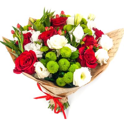 Роза Эквадорская — 7шт, хризантема кустовая — 3шт, эустома — 3шт, гиперикум — 2шт, рускус, крафт, лента