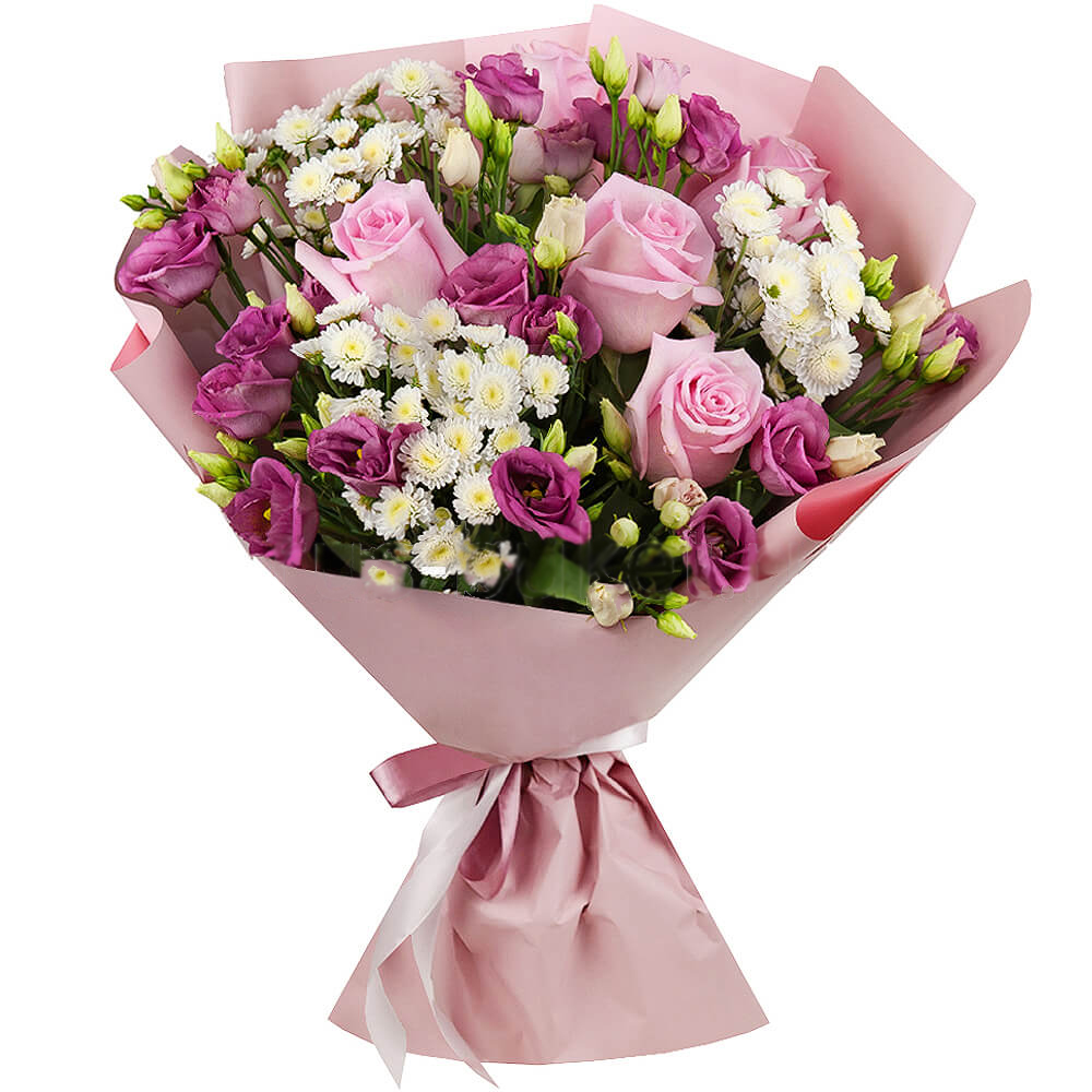 Роза Эквадорская 50см 5шт, хризантема 3шт, эустома 5шт, упаковка, лента