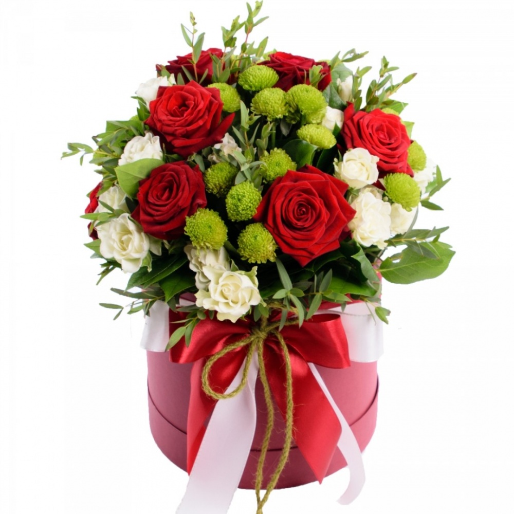 Роза Эквадор 50см 7шт, хризантема кустовая 3шт, эустома 3шт, фисташка, салал, коробка шляпная 20см, оазис, лента, джут