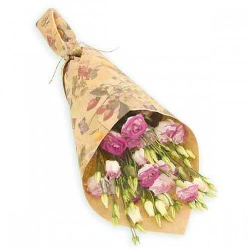 Хризантема кустовая 3шт, эустома 3шт, кустовая гвоздика 1шт, лаванда, рускус 3шт, крафт, лента