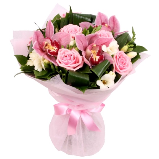 Орхидея цимбидиум — 3шт, роза эквадорская 50см — 7шт, эустома — 2шт, аспидистра, упаковка, лента