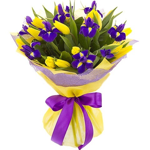 Тюльпан — 15шт, ирис — 10шт, салал, сетка/фетр, лента