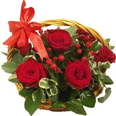Роза Эквадорская — 7шт, гиперикум — 2шт, фисташка, питтоспорум, оазис, корзина 20-21см, лента. Внимание: внешний вид композиции может незначительно отличаться от фото.