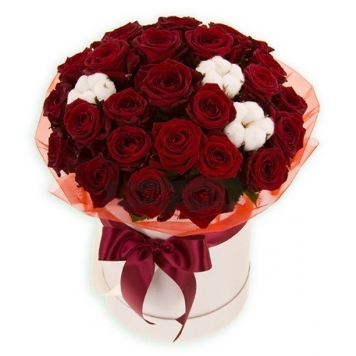 роза Эквадорская — 31 шт., хлопок — 3 шт., оазис, коробка, органза