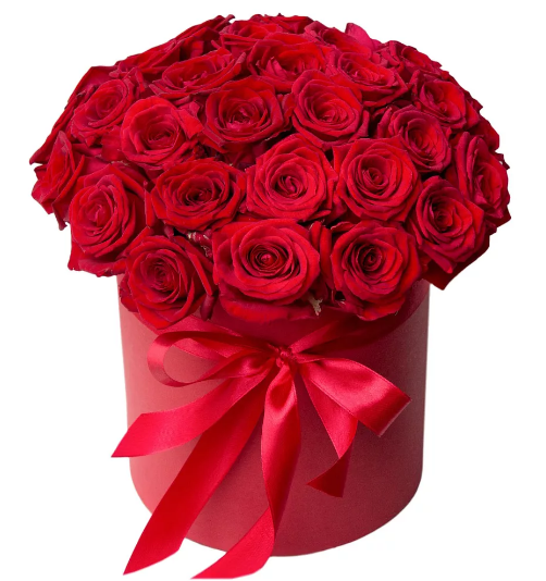 Роза Эквадорская 50см — 31шт, оазис, лента, шляпная коробка 22,5см. Внешний вид композиции может незначительно отличаться от фото.