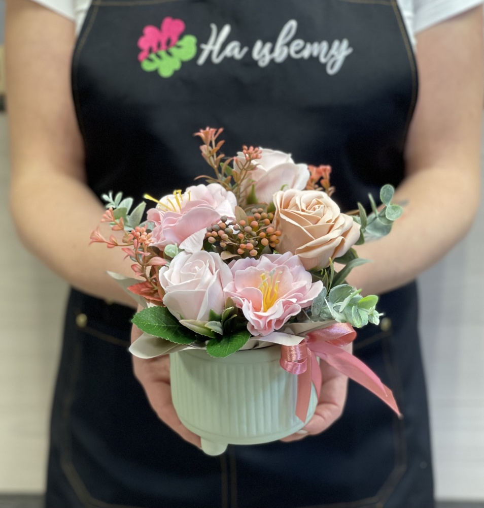 Мыльные розы, декоративная зелень и цветы, оазис, керамическое кашпо.