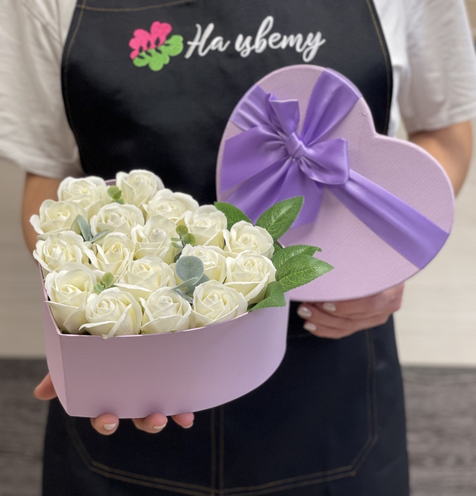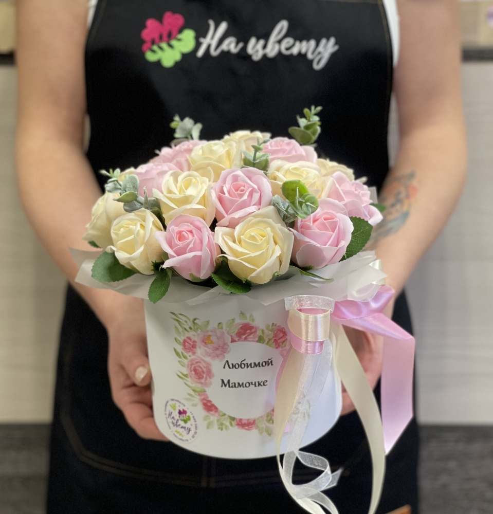 Мыльные розы — 7шт, декоративная зелень, оазис, стаканчик, лента. Размеры композиции: 22см15см