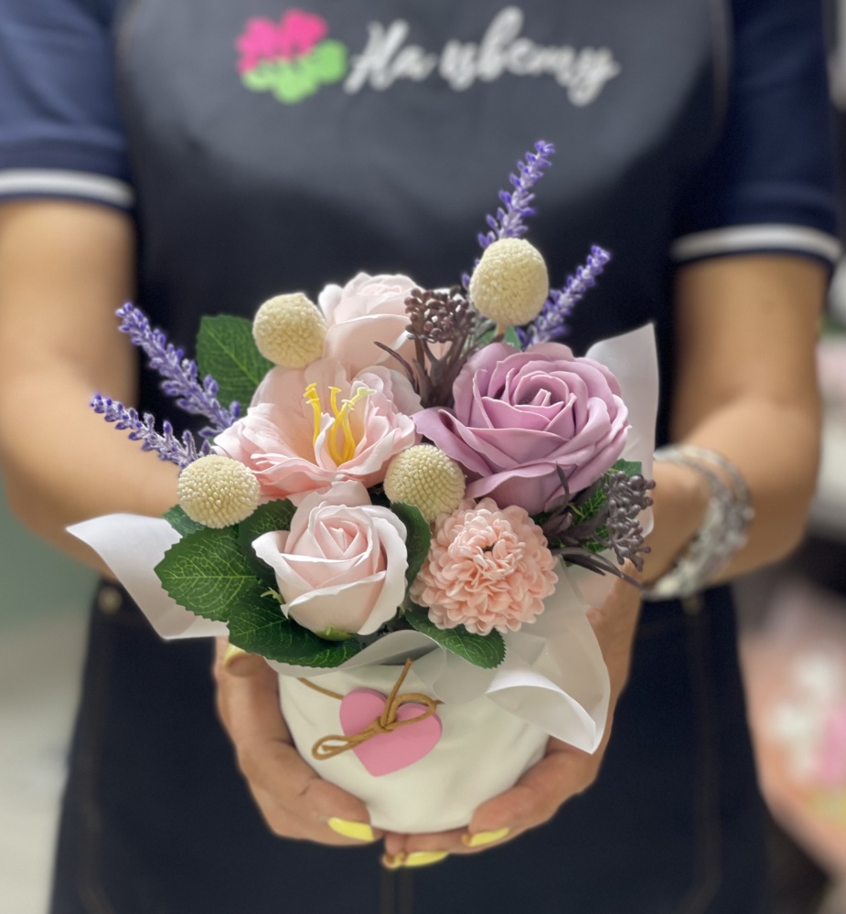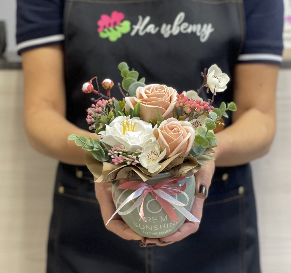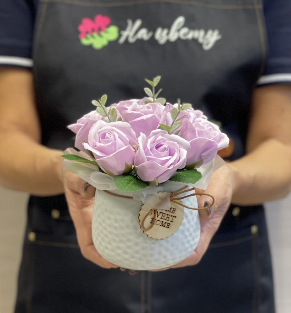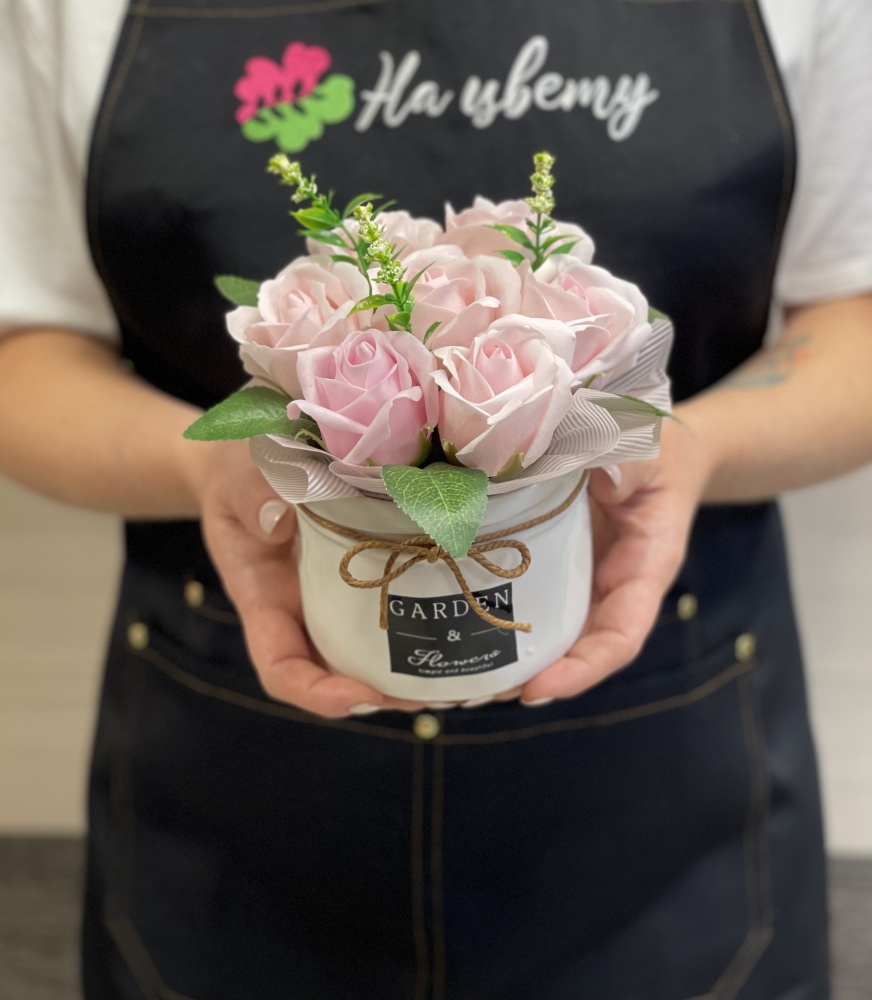 Мыльные розы — 7шт, декоративная зелень, оазис, керамическое кашпо. Размеры композиции: 10см16см