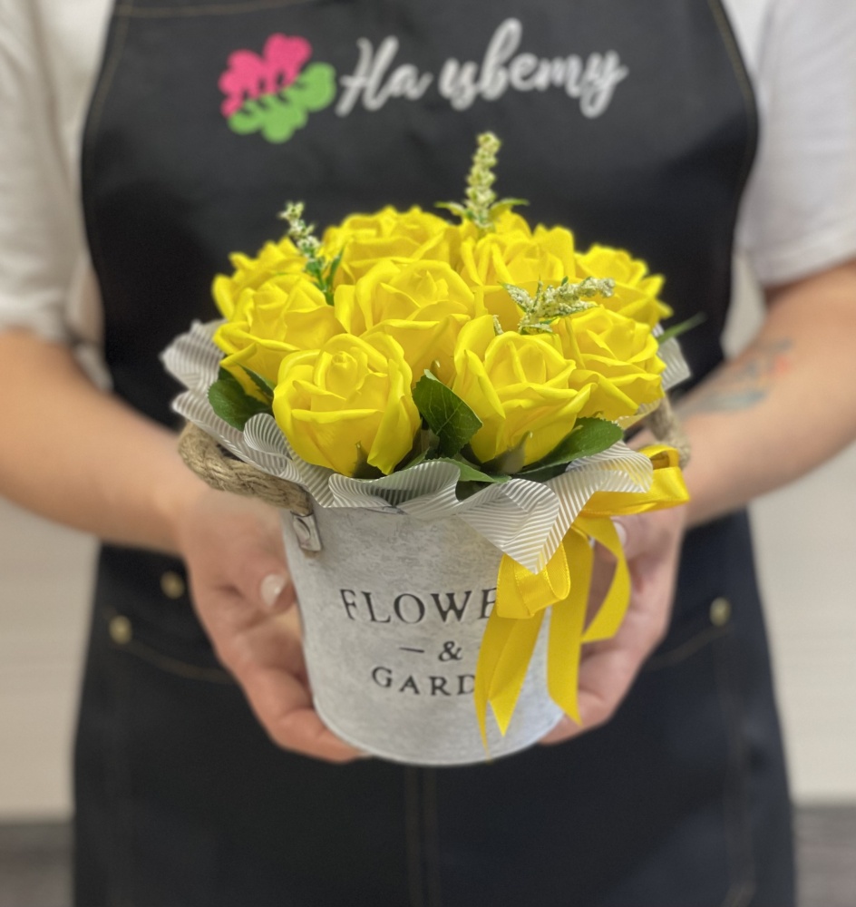 Мыльные розы — 11шт, оазис, ведерко «Flowers & Garden», лента. Размеры композиции: 20см20см