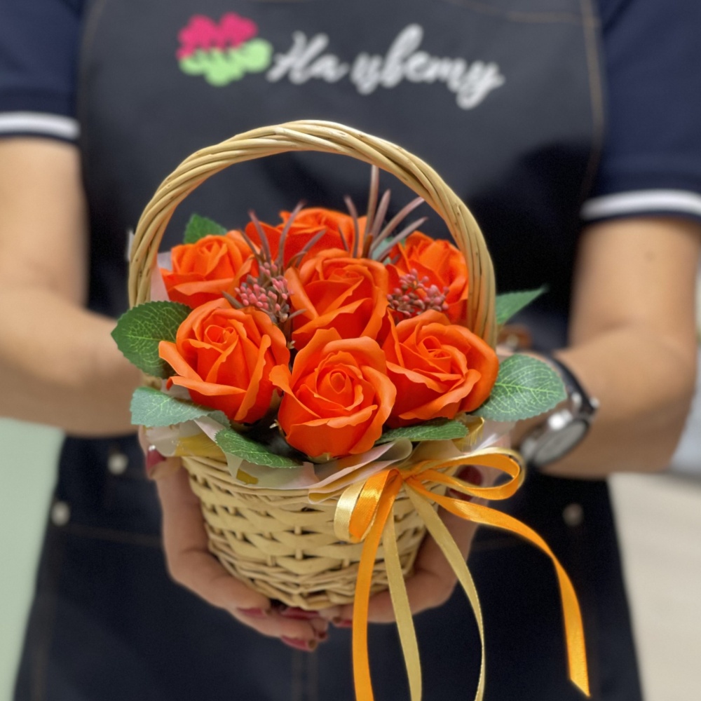 Мыльные розы — 7шт, декоративная зелень, оазис, корзина, подложка, лента.
