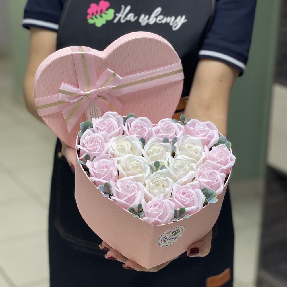 Мыльные розы — 7шт, декоративная зелень, оазис, шляпная коробка, лента. Размеры композиции: 12см22см.