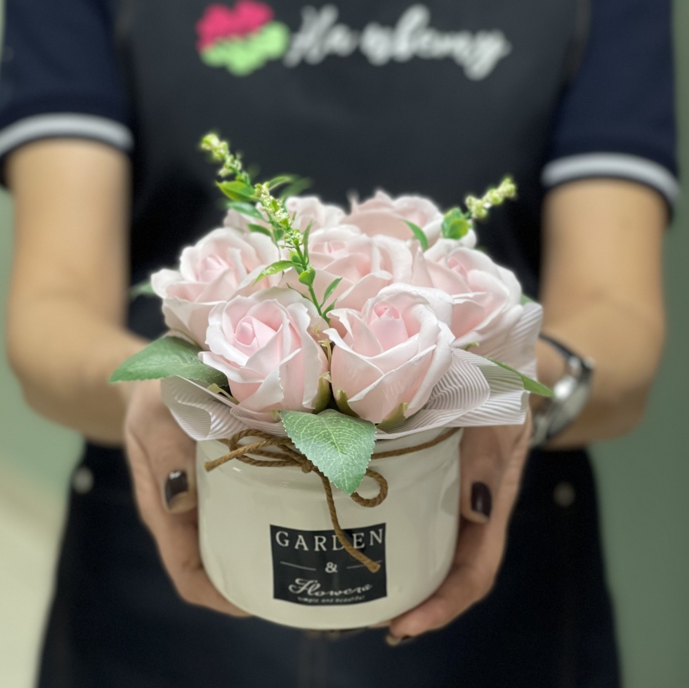 Мыльные розы — 7шт, декоративная зелень, оазис, стаканчик, лента. Размеры композиции: 22см15см