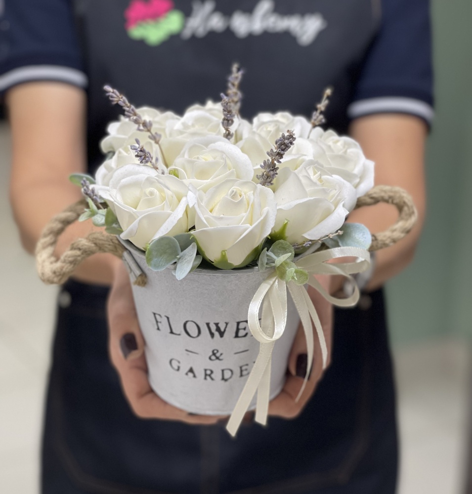 Мыльные розы — 11шт, оазис, ведерко «Flowers & Garden», лента. Размеры композиции: 20см20см
