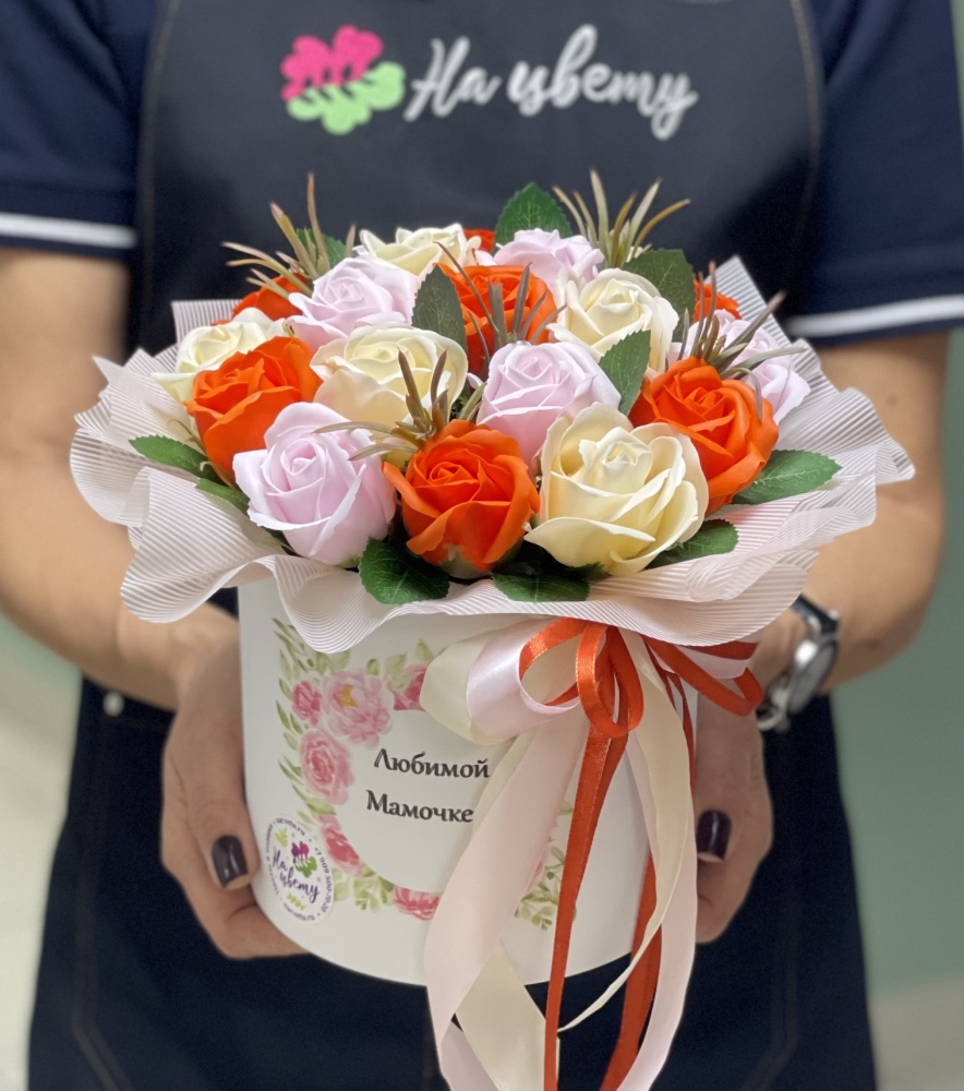 Мыльные розы — 11шт, декоративная зелень, оазис, сумочка, лента. Размеры композиции: 21см10см22см