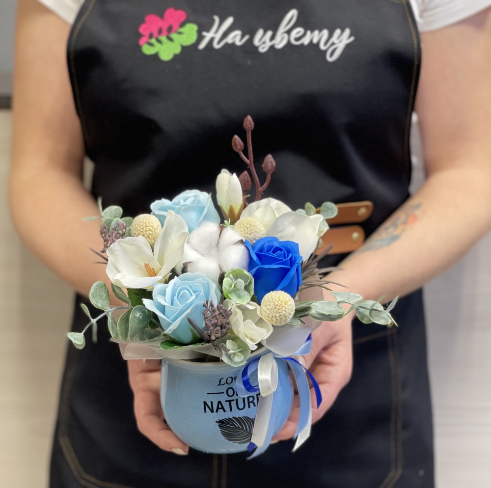 Мыльные розы — 7шт, декоративная зелень, оазис, керамическое кашпо. Размеры композиции: 10см16см