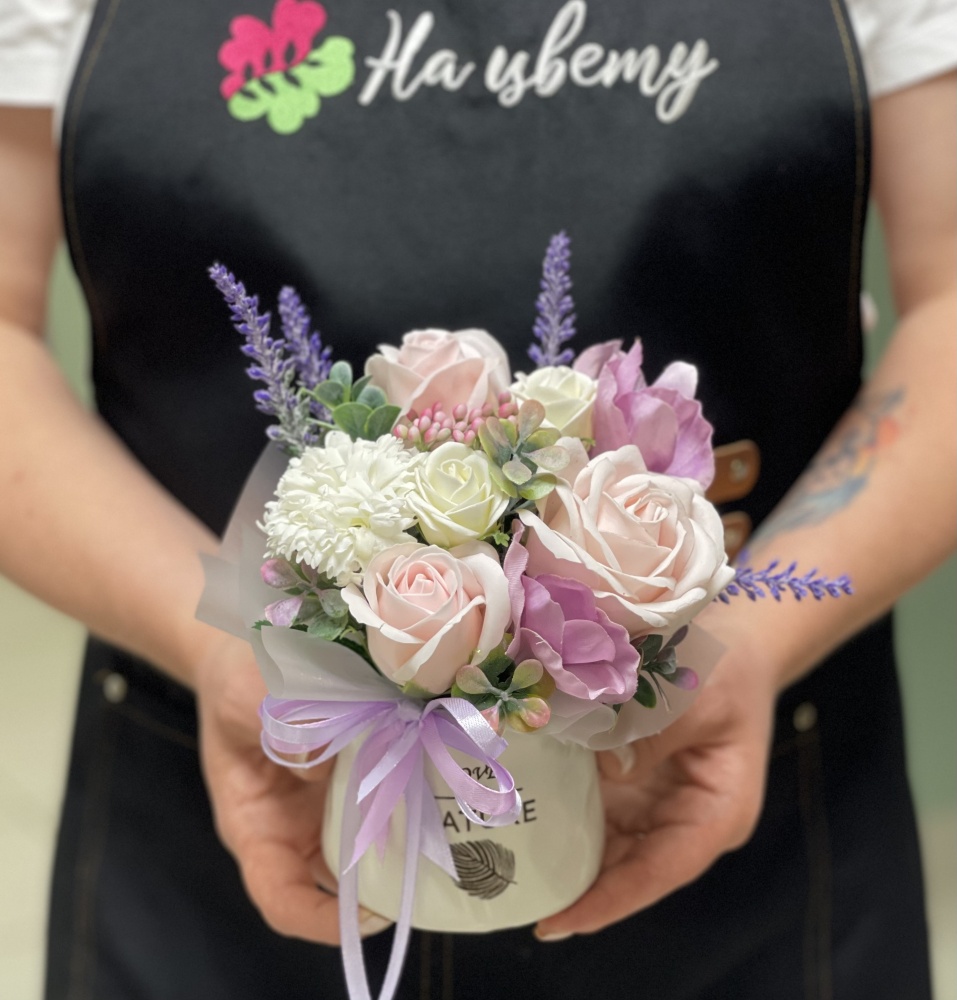 Мыльные розы — 7шт, декоративная зелень, оазис, керамическое кашпо. Размеры композиции: 10см×16см