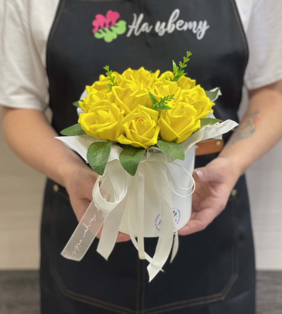 Мыльные розы — 11шт, декоративная зелень, оазис, шляпная коробка, лента. Размеры композиции: 12см22см.