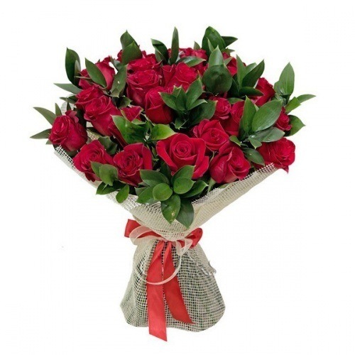 роза Эквадорская 50 см - 45 шт., рускус, сетка, лента.