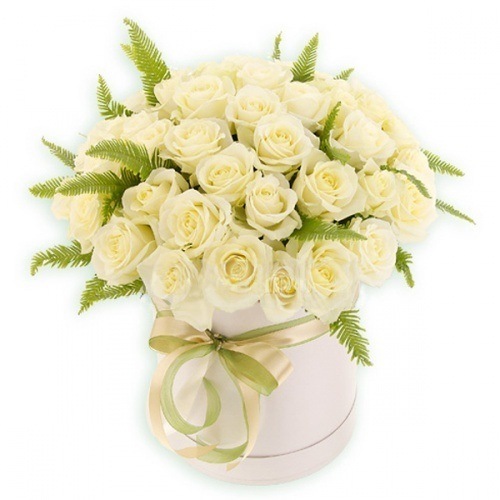 Роза Эквадорская 50см — 25шт, оазис, шляпная коробка 22,5см. Внешний вид композиции может незначительно отличаться от фото.