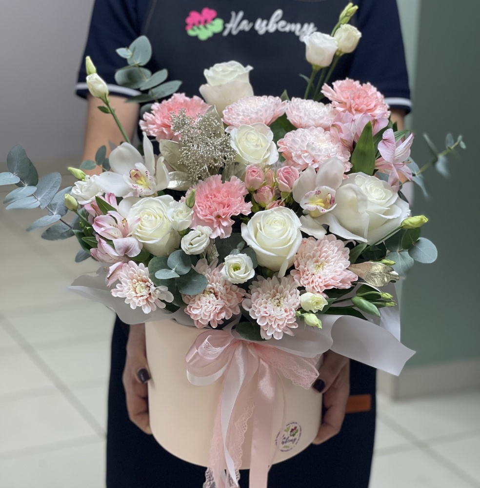 Орхидея цимбидиум 5шт, роза эквадорская 50см 7шт, эустома 4шт, эвкалипт, коробка шляпная 20см, оазис