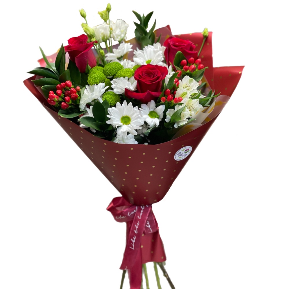 Роза Эквадорская 50см 3шт, хризантема кустовая 3шт, эустома 1шт, альстромерия 1шт, гиперикум 2шт, рускус 3шт, упаковка, лента