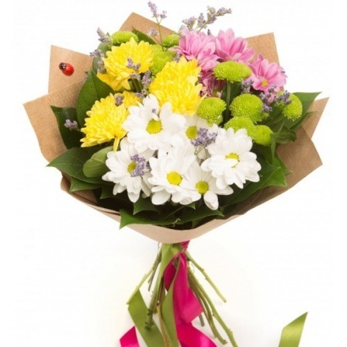 Гербера — 5шт, хризантема кустовая — 3шт, статица, гипсофила, крафт, лента
