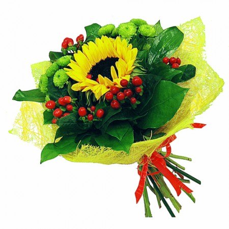 Гелиантус -1шт, хризантема кустовая — 2шт, гиперикум 3шт, салал, сизаль, лента