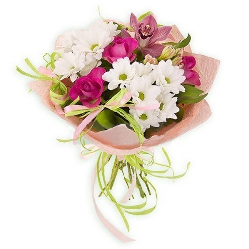 Роза эквадорская 50см — 3 шт, хризантема кустовая — 3 шт, альстромерия — 1 шт, орхидея цимбидиум — 1 шт, салал, декор, крафт. лента