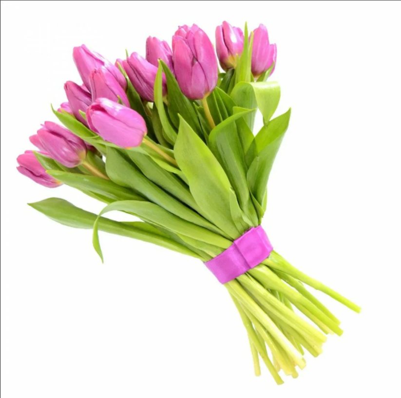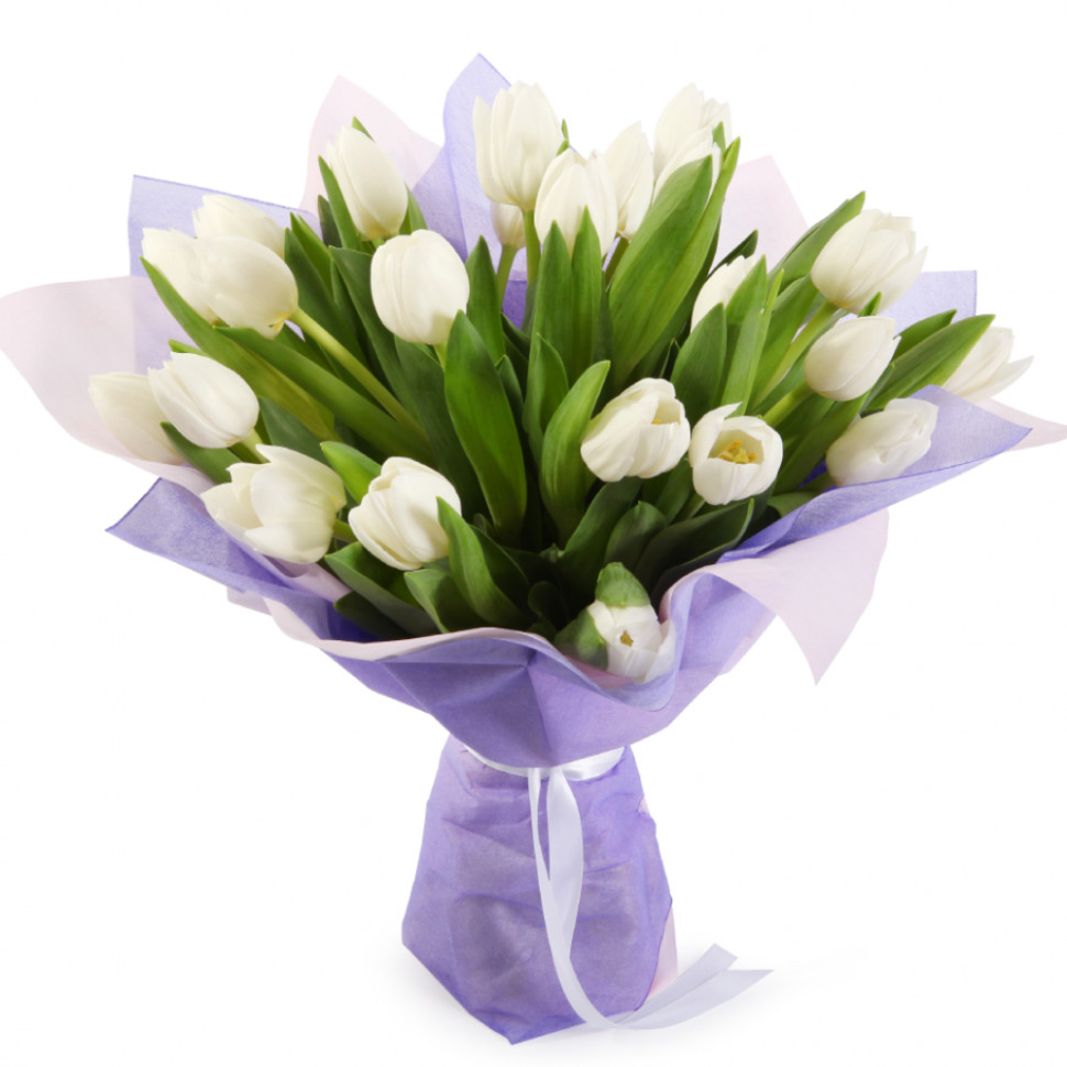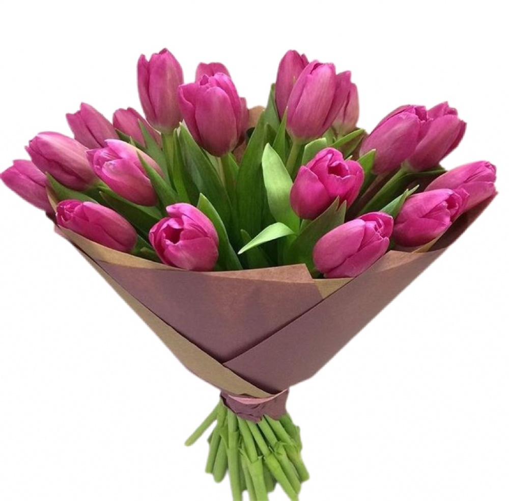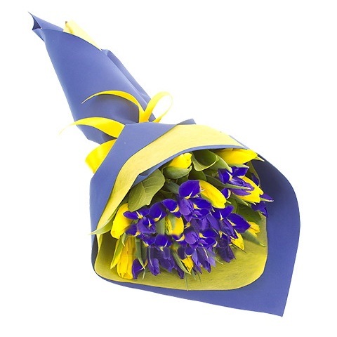 Тюльпан — 11 шт, ирис — 10шт, рускус, упаковка, лента
