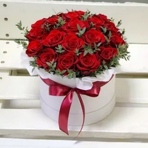 Роза Эквадорская 50см — 19 шт, эвкалипт, оазис, коробка, лента.