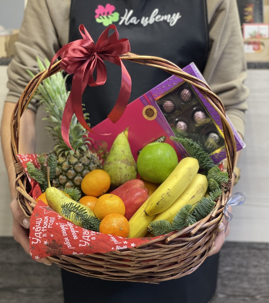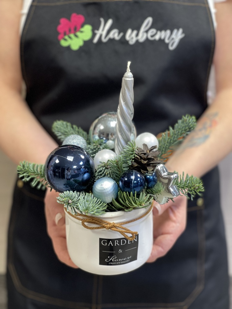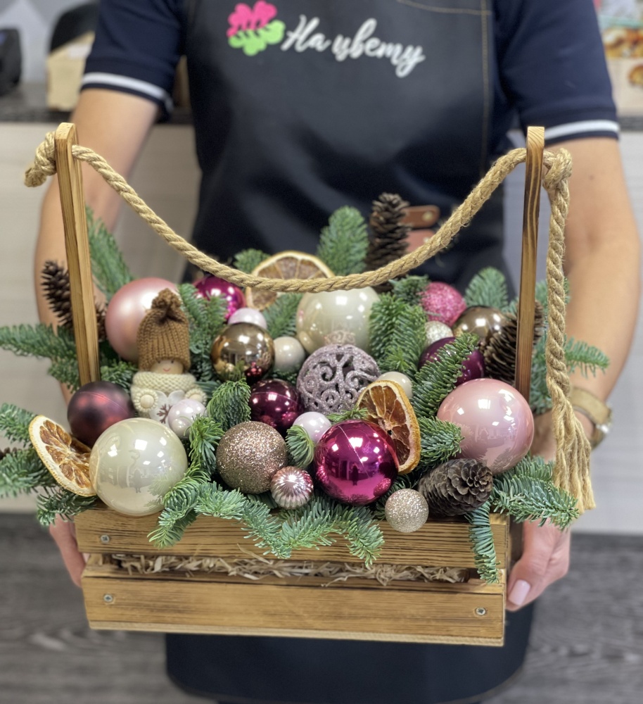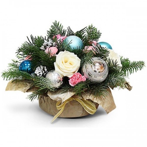 Роза эквадорская — 3шт, гвоздика кустовая — 1-2шт, елочный шар — 8шт, шишки, нобилис, оазис, крафт, лента