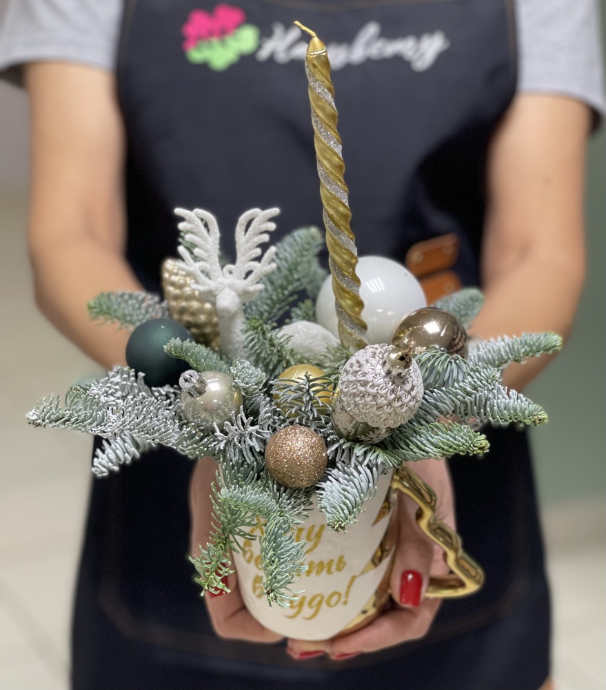 Роза эквадорская — 3шт, гвоздика кустовая — 1-2шт, елочный шар — 8шт, шишки, нобилис, оазис, крафт, лента